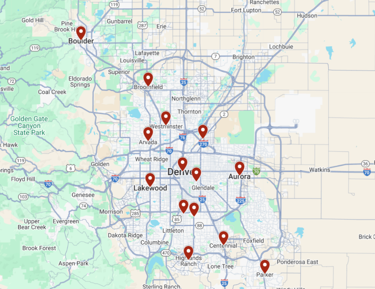 Aurora, Arvada, Boulder, Broomfield, Castle Rock, Centennial, Cherry Creek, Cherry Hills, Commerce City, Denver, Englewood, Ft Collins, Highlands Ranch, Lakewood, Parker, Westminster